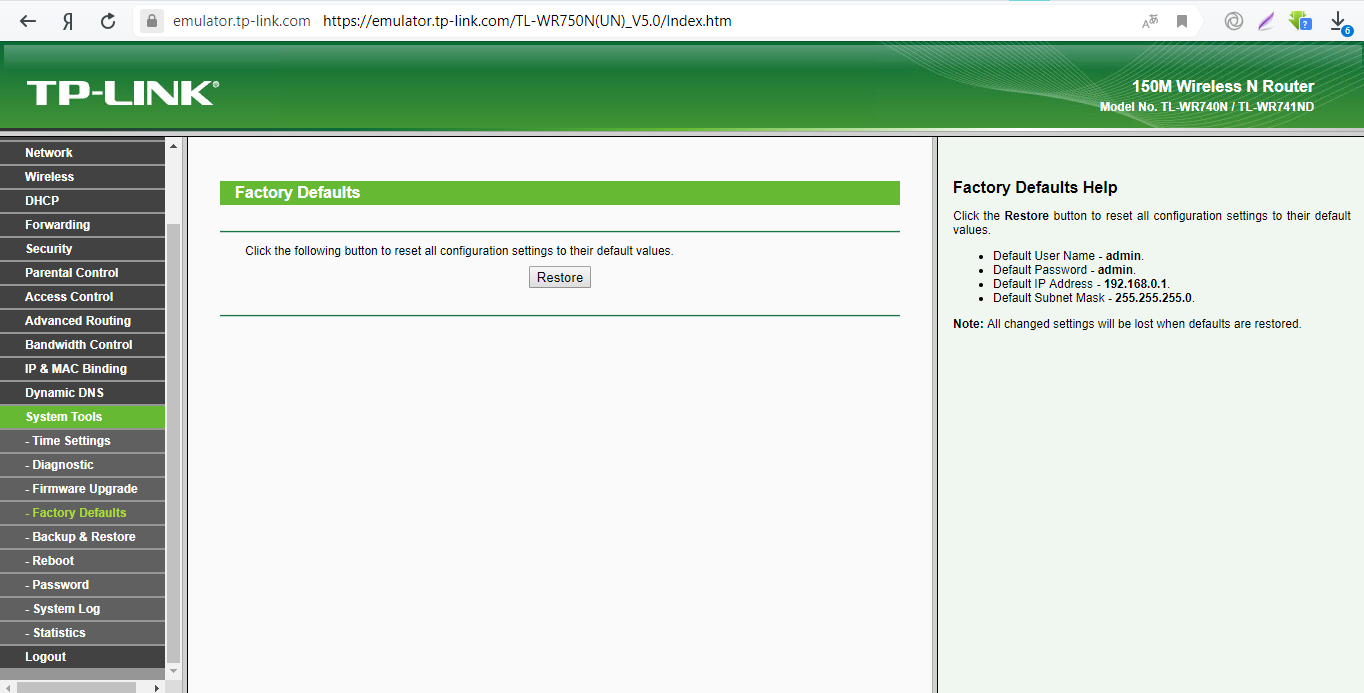 Вернуть заводские настройки можно через веб-интерфейс: для этого откройте раздел System Tools, щёлкните по пункту Factory Defaults. Нажмите на Restore, чтобы запустить сброс, и подтвердите действие в диалоговом окошке. Роутер перезагрузится уже с заводскими настройками.