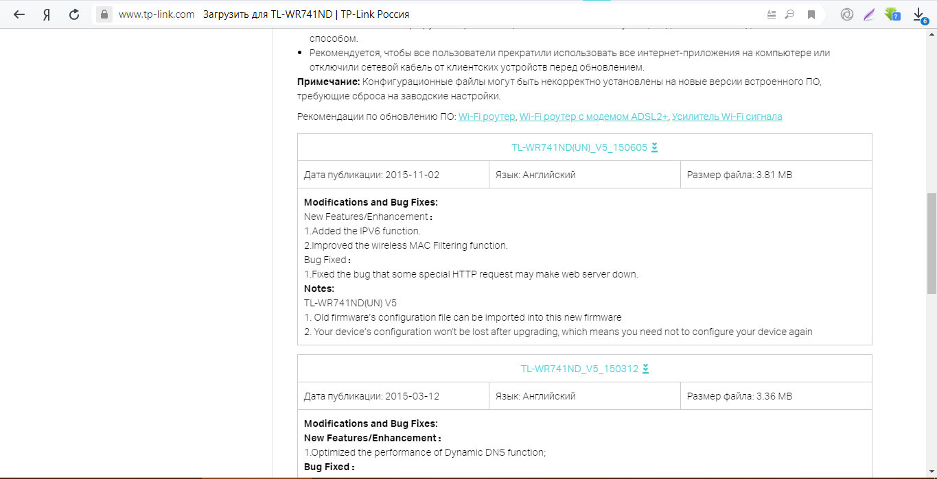- Переходим по этой ссылке, чтобы попасть на официальную страницу производителя с моделью TL-WR741N. Прокручиваем страницу и жмём на ссылку с последней версией прошивки (она будет в самом верху, но смотрим обязательно на дату релиза).