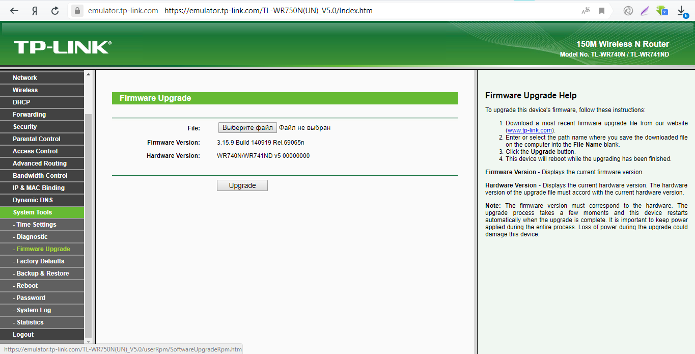 - Запускаем в разделе System Tools вкладку Firmware Upgrade. Жмём на «Выберите файл».