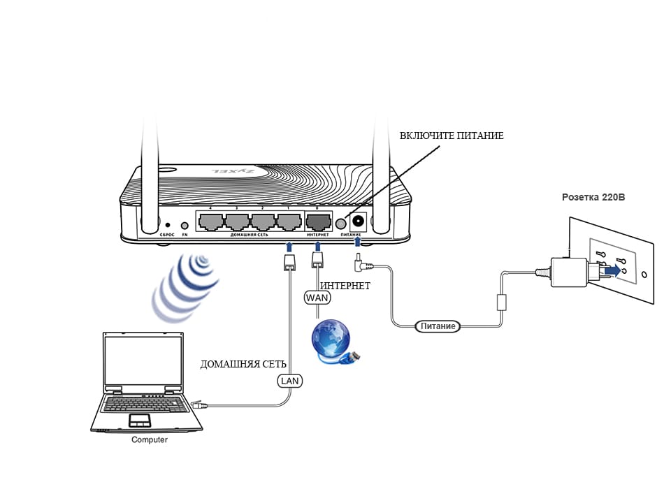 В первую очередь вам нужно установить связь между компьютером (или другим устройством, например, смартфоном) и роутером. Есть два варианта: кабель Ethernet (более безопасный метод) или заводская сеть «Вай-Фай» роутера. Как только вы включите сетевое устройство, оно сразу начнёт раздавать сигнал, даже если интернета не будет.