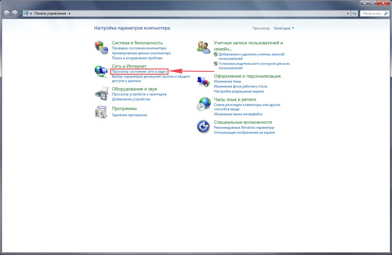- На панели перейдите в раздел для отображения состояния сети либо в блок для управления сетями, если стоит для просмотра значение «Крупные значки».