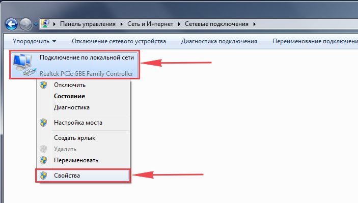 - Отыщите плитку с локальным соединением или беспроводным подключением (зависит от того, что вы использовали — кабель или «Вай-Фай»). Вызовите правой клавишей мышки дополнительное меню и щёлкните по «Свойства».