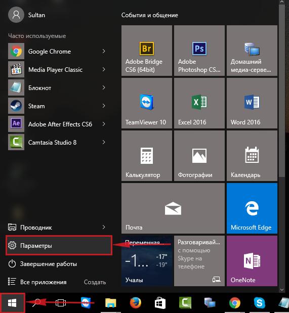 - Если у вас «Виндовс» 10, перейти к настройкам можно через «Параметры»: раскройте «Пуск» кликните по шестерёнке над кнопкой выключения ПК.
