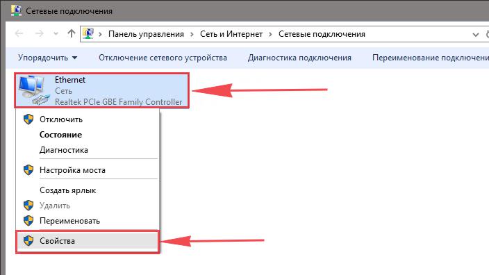 - Кликните по Ethernet правой клавишей и выберите свойства. Далее шаги повторяются: свойства протокола IPv4 и автоматическое получение данных.
