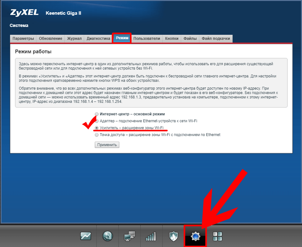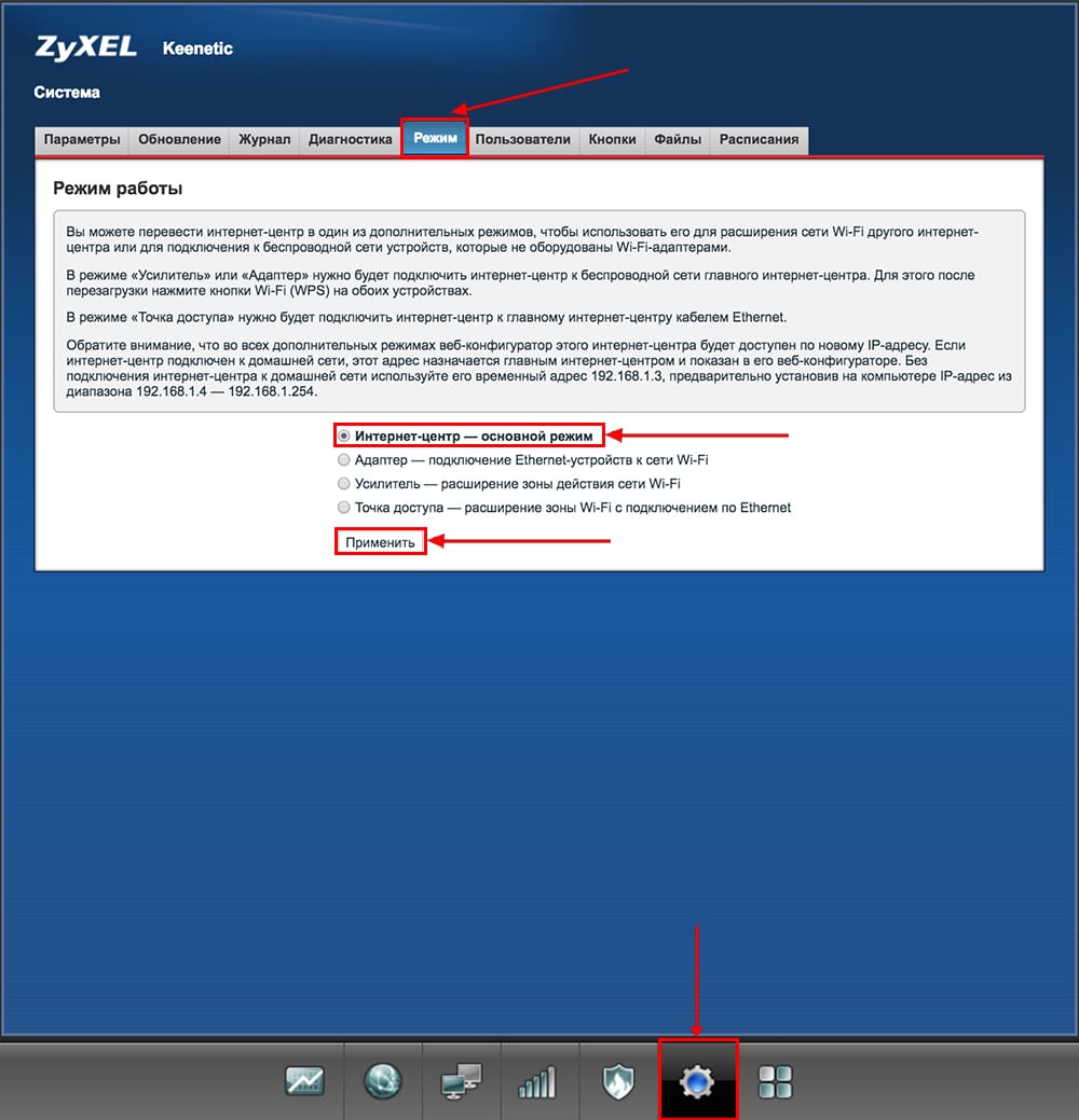 - Если перейдёте в конфигуратор, сразу включите вкладку «Система» (шестерёнка внизу). В блоке с режимами установите «Интернет-центр» либо «Точка доступа». Первое значение ставим, если для подключения к интернету провайдера вам нужно писать пароль и логин (например, при соединении PPPoE или PPTP).