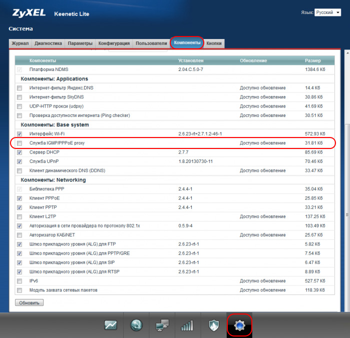 - Перейдите в раздел с шестерёнкой и щёлкните по предпоследней вкладке «Компоненты». Убедитесь, что рядом с пунктом «Служба IGMP» стоит галочка.