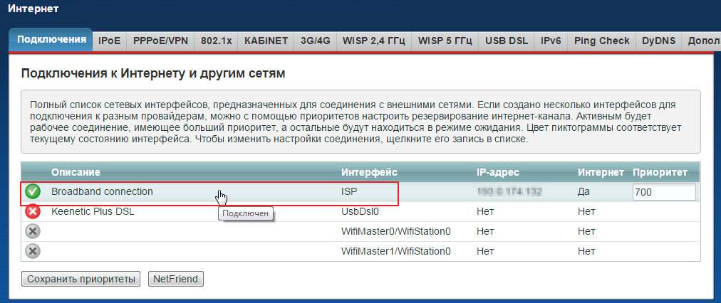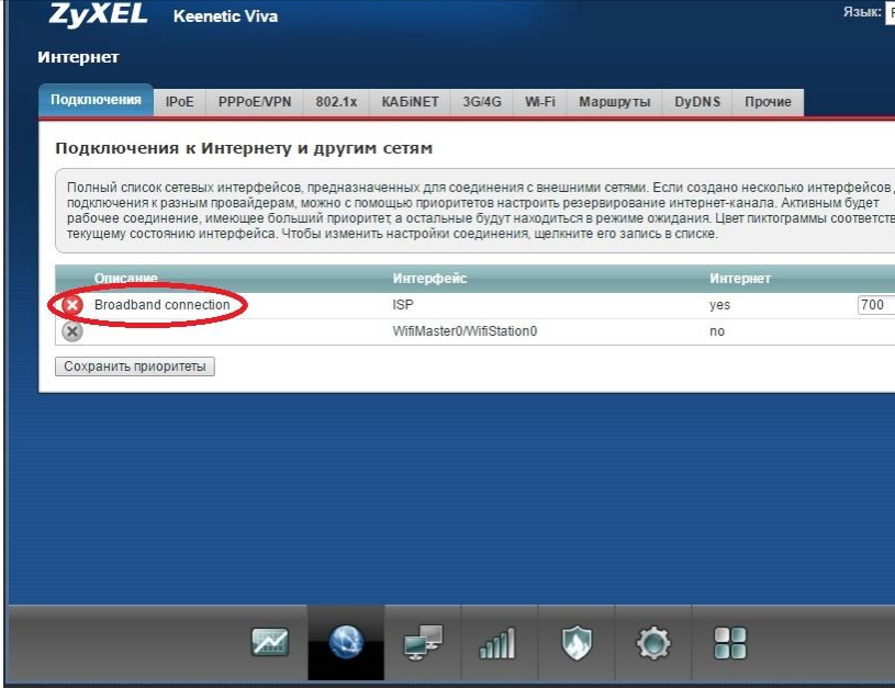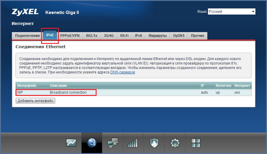 - Раскройте панель «Интернет» (вкладка с планетой внизу). В разделе «Список (Подключения)» переходим к параметрам Broadband connection. Отмечаем пункты «Использовать разъём» для WAN, «Включить интерфейс» и «Использовать для выхода в интернет».