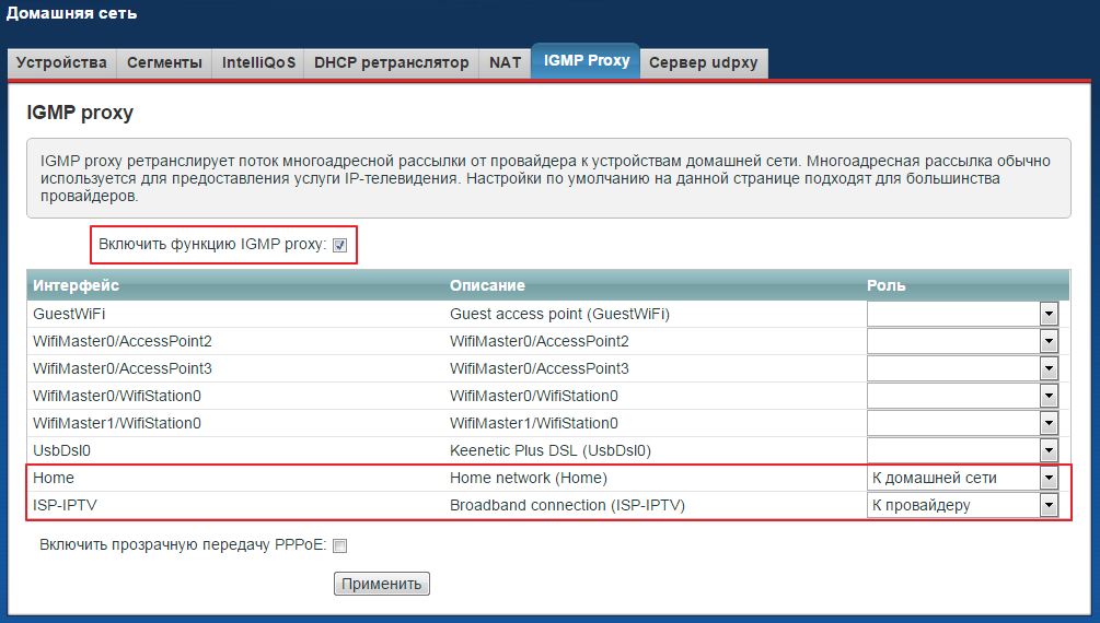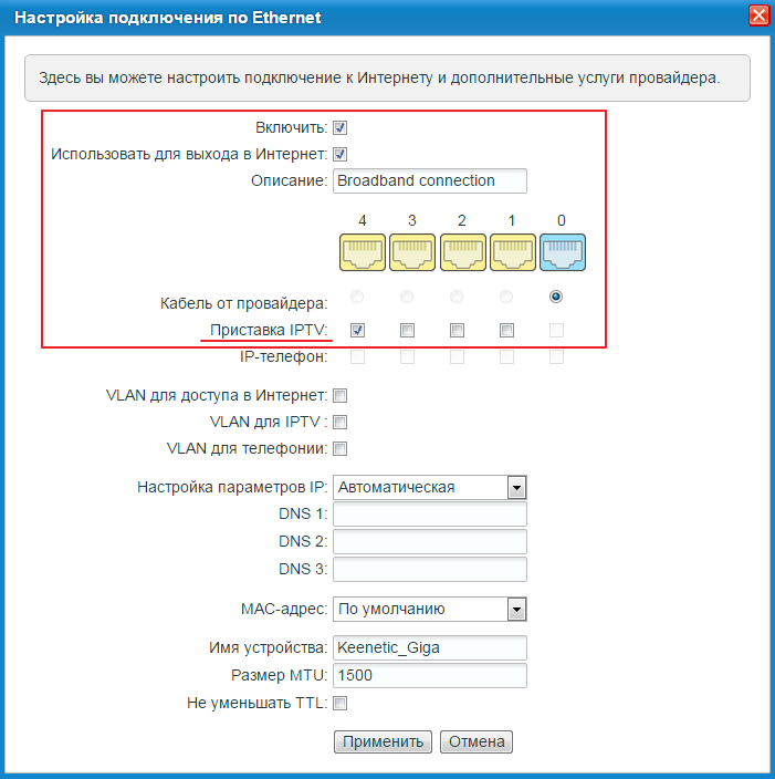 - Поставьте отметку для «Приставка IPTV» под тем гнездом, к которому подключили кабель LAN. Щёлкните по «Применить», а затем перезагрузите приставку.