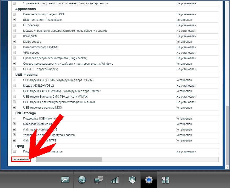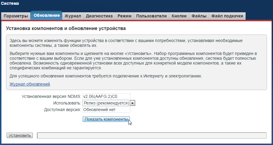 - Когда выберете компоненты, щёлкните по «Установить» и подождите, пока система обновится. Помните, что отключать роутер по время апдейта категорически запрещается.