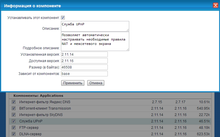 - Щёлкните по «Показать компоненты». Выберите те компоненты, которые вам нужны. Снимать изначально установленные галочки не рекомендуется, так как прошивка после обновления может перестать работать. Если вы хотите узнать, за что отвечает конкретный компонент, кликните по его названию — откроется окошко с информацией.