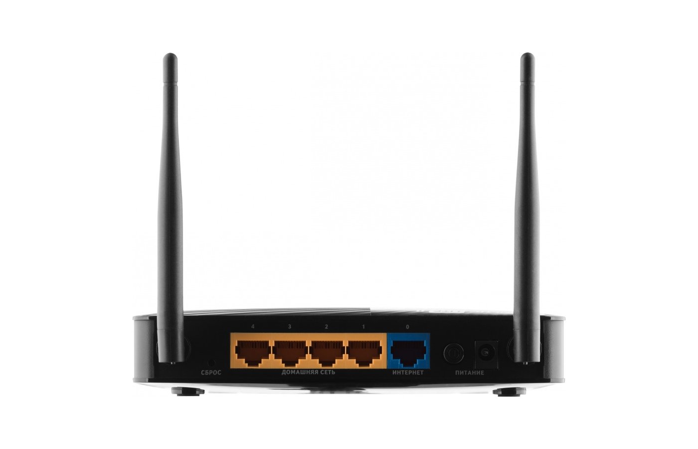 На задней панели 5 сетевых разъёмов: 4 для локальной (домашней) сети и 1 для кабеля провайдера. Слева от выходов расположены кнопки «Сброс» и Fn, а справа — клавиша питания и разъём для адаптера питания.