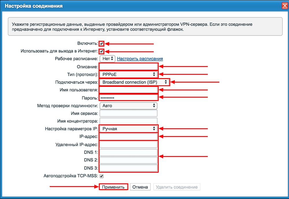 - Отмечаем строчку «Задействовать». В качестве вида протокола ставим PPPoE. Описание ставим любое. В перечне «Подключаться» щёлкаем по Broadband connection ISP. Адрес сервера не вписываем. При необходимости ставим ручной ввод IP-адреса и вводим необходимые данные.