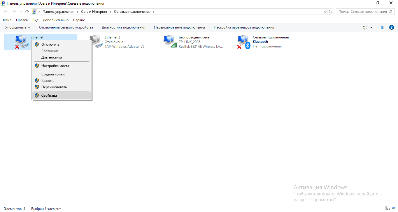 - Щёлкните по беспроводному или проводному подключению ПКМ (в зависимости от того, какое соединение вы выбрали — Wi-Fi или кабель) и выберите «Свойства».