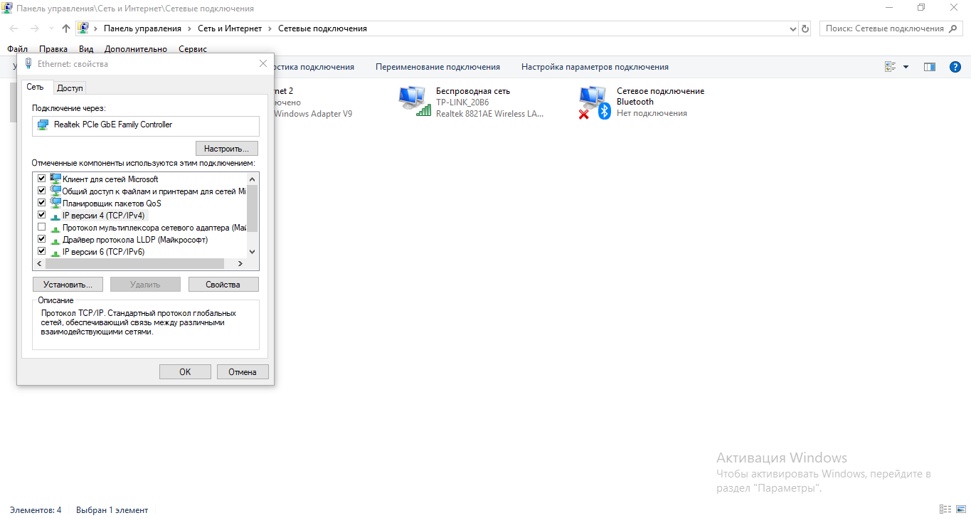 - Проверьте свойства протоколов IPv4 и IPv6 (в зависимости от того, какой протокол использует ваш провайдер).
