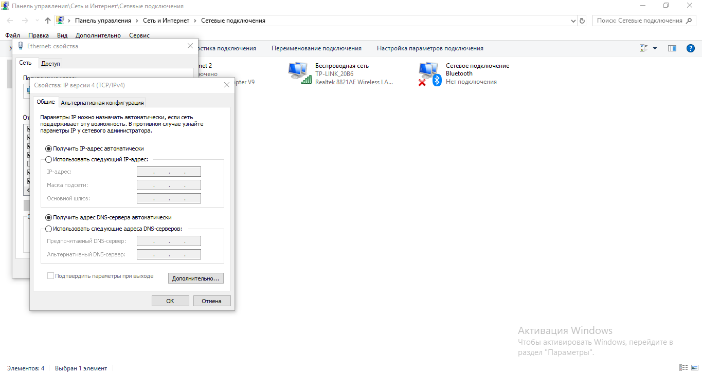 - Убедитесь, что в свойствах стоит автоматическое получение IP-адреса и адреса DNS.