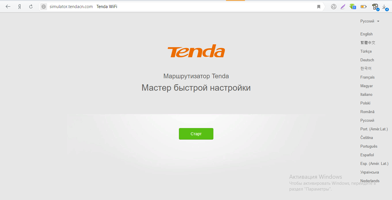 - На следующей странице сразу можно поменять язык с помощью выпадающего меню справа. К сожалению, русский язык интерфейса действует не для всех моделей Tenda. Если его нет в списке, придётся использовать оболочку на английском.