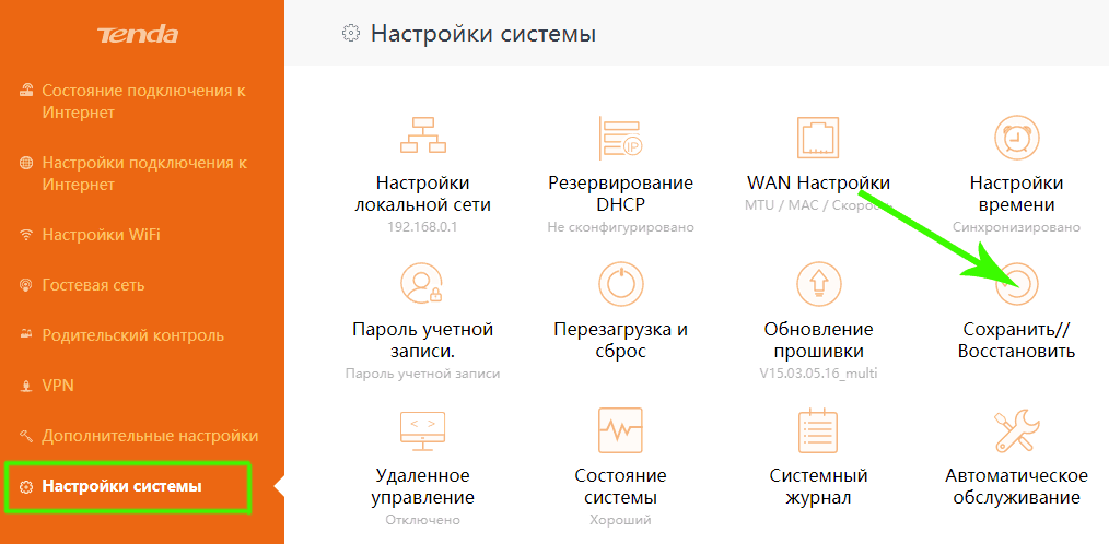 - Теперь возвращаемся в личный кабинет роутера в браузере. Сделаем резервную копию настроек на случае, если обновление пройдёт неудачно. Переходим в плитку «Сохранить/Восстановить».