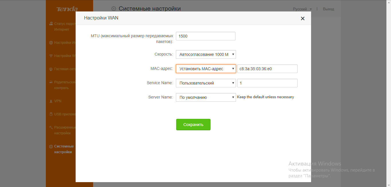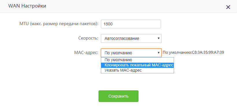 - Заходим в настройки WAN в системных параметрах (куда заходили для клонирования MAC-адреса) и ставим в MTU значение не менее 1500. Применяем настройки.