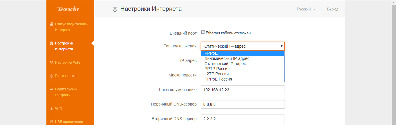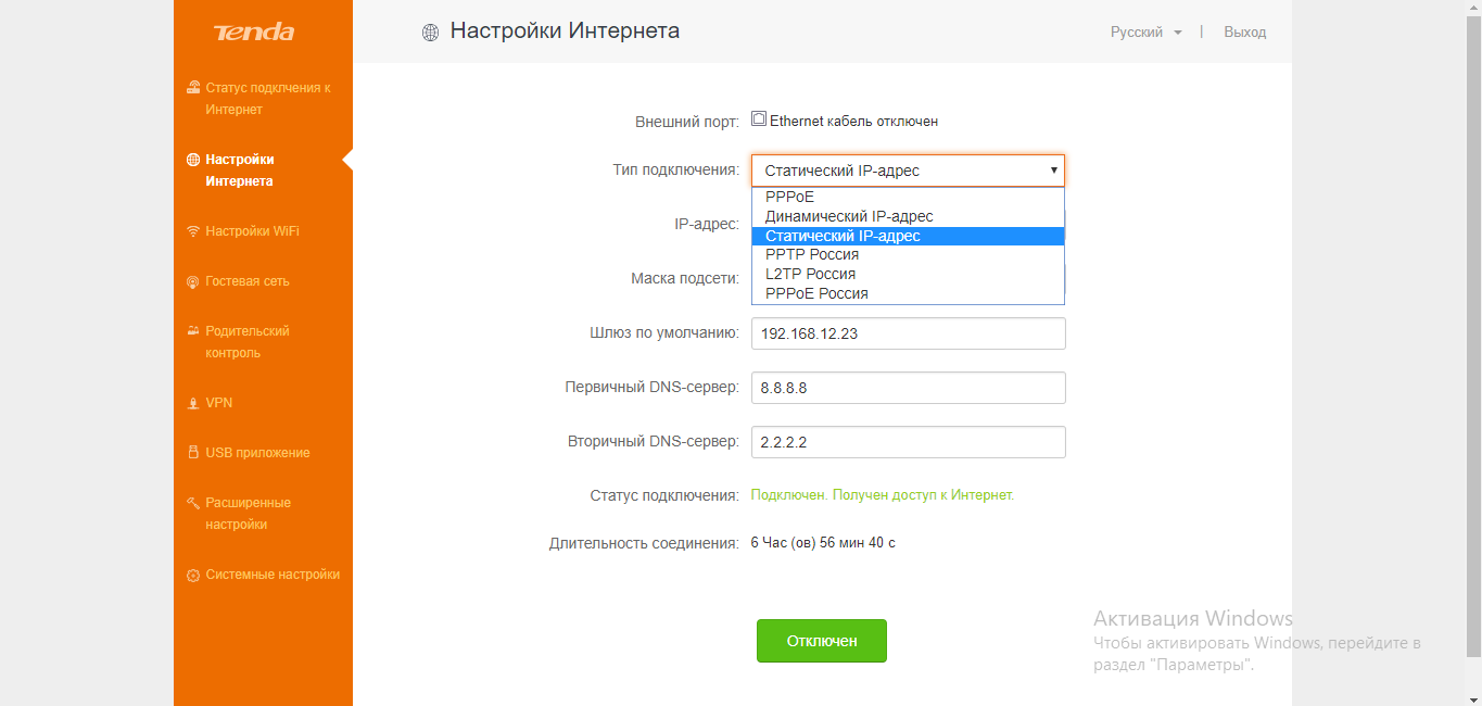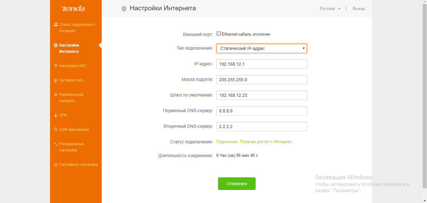 Настроить подключение по статическому IP-адресу на маршрутизаторе Tenda нужно следующим образом: