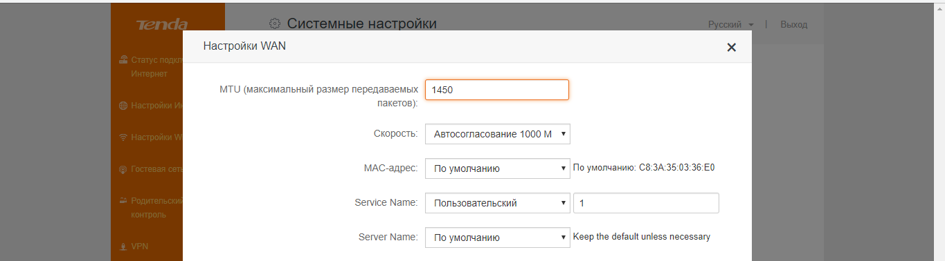 - В параметре MTU (плитка «Настройки WAN» в системных параметрах) ставим значение меньше 1500, например, 1450.