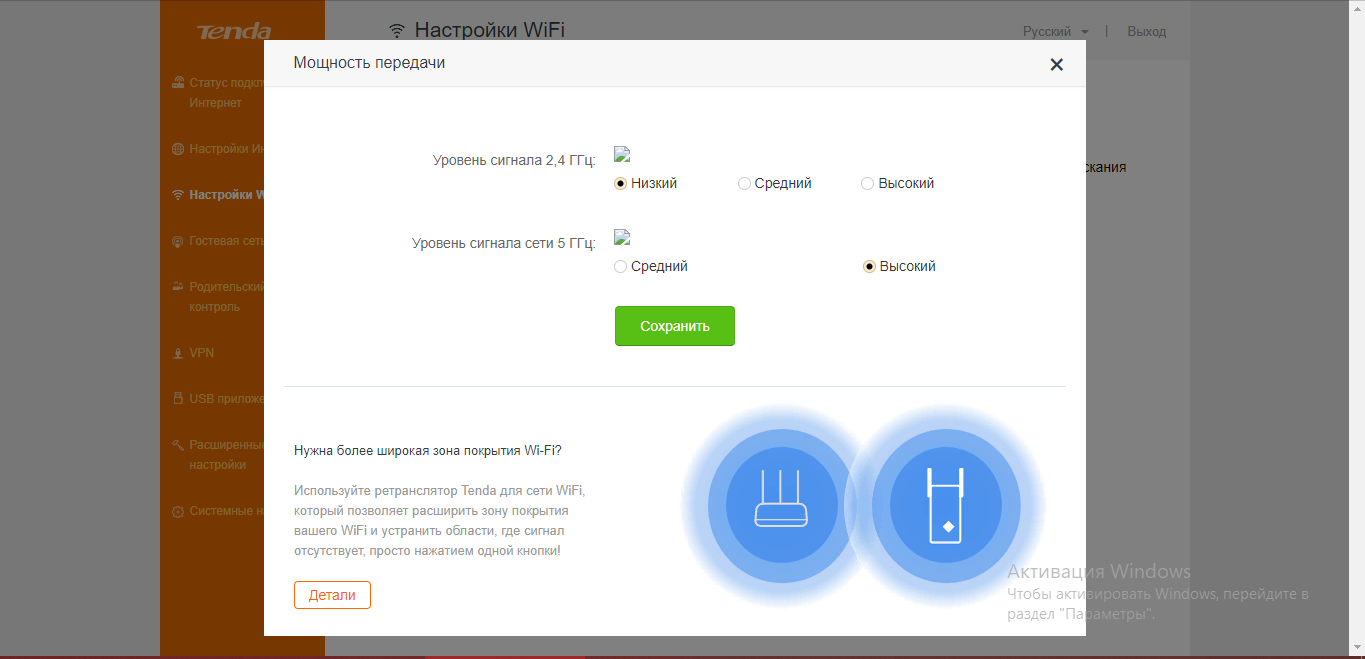 - В блоке «Мощность передачи» определяем уровень сигнала роутера для каждой из частот.