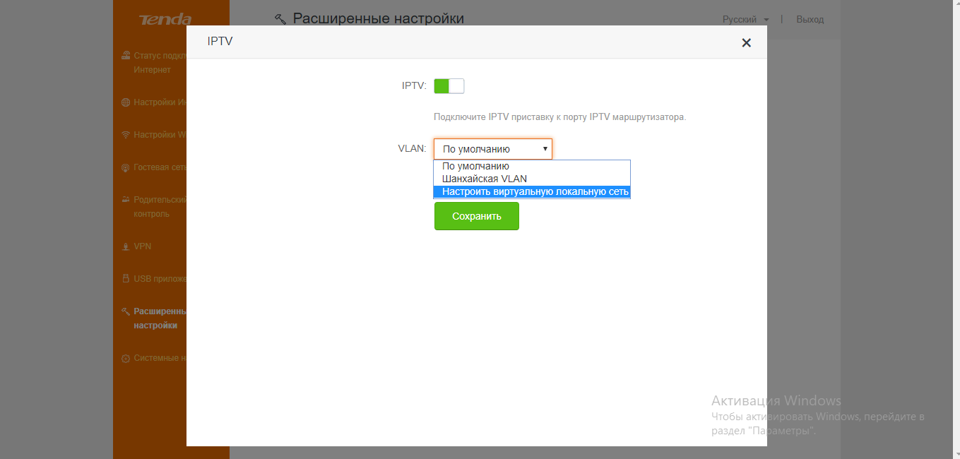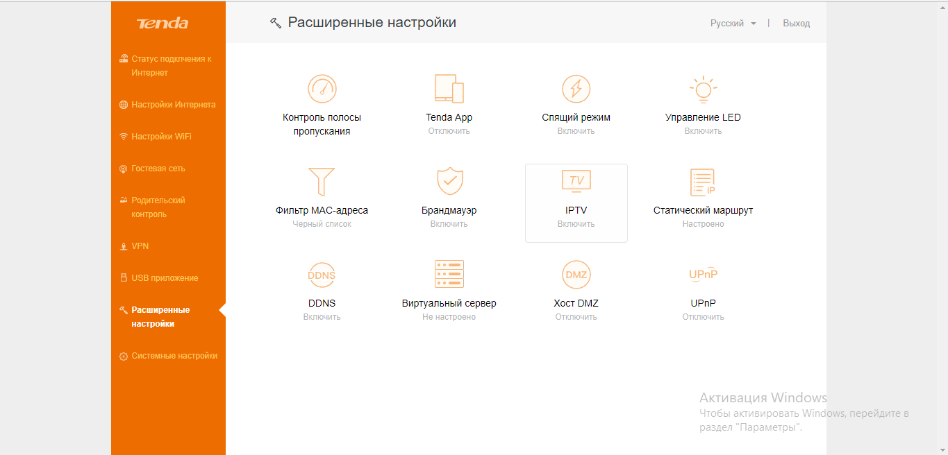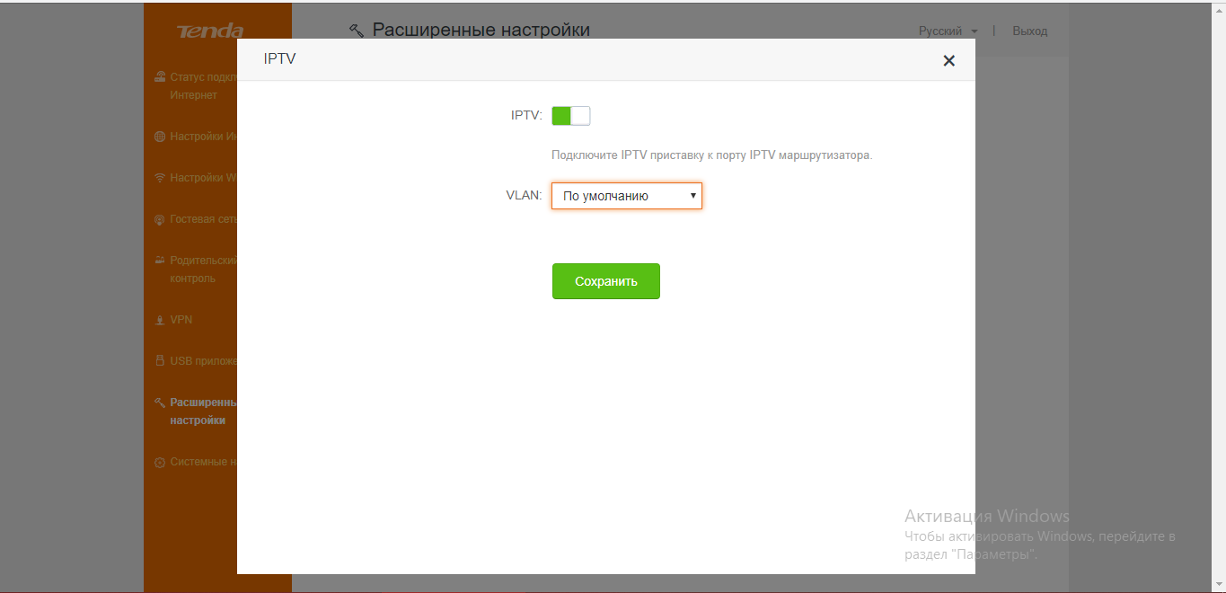 Если вы приобрели роутер Tenda с поддержкой IPTV и хотите включить цифровое ТВ, подключите по кабелю купленную ТВ-приставку к порту LAN на роутере. Также активируйте опцию IPTV в настройках маршрутизатора: