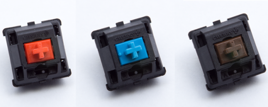 Механические клавиатуры могут использовать различные типы переключателей: линейные с постоянным сопротивлением (например, Cherry MX Red), тактильные с не слышимым ударом (например, Cherry MX Brown) и щелкающие (например, Cherry MX Blue), с слышимым щелчком.