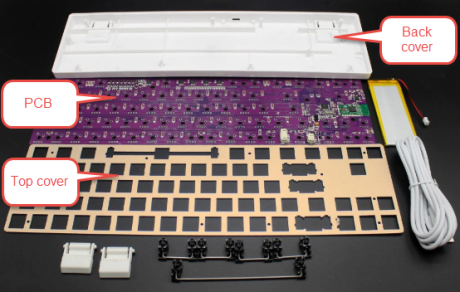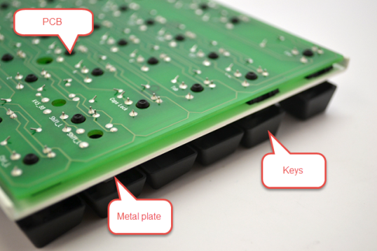 В то время как тип клавиш, используемых в клавиатуре, влияет на взаимодействие с пользователем, а иногда и на его выносливость, долговечность клавиатуры зависит от материалов, из которых она изготовлена. Взгляните на рисунок ниже, где вы видите самодельный набор для создания механической клавиатуры. У вас есть задняя рамка (обычно из пластика), которая действует как задняя крышка, печатная плата (PCB), которая связывается с клавишами и отправляет ваши нажатия клавиш на компьютер, задняя панель, на которой установлены фактические переключатели/клавиши, и верхняя крышка. Иногда задняя панель совпадает с верхней крышкой или не существует, и переключатели устанавливаются непосредственно на печатной плате.