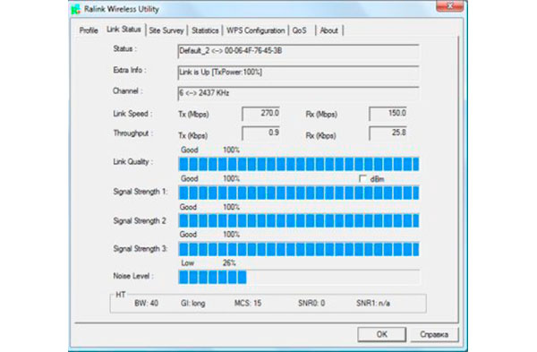 - Во вкладке Statistics можно наблюдать загруженность адаптера, скорость приёма и передачи данных, а также соотношение сигнал/шум.