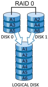 RAID0 (striping — «чередование») создается для ускорения работы HDD. Несколько дисков работают параллельно, информация разбивается на блоки и записывается на диски поочередно. Диски образуют единый логический диск.