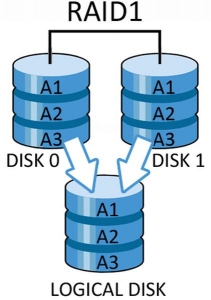 RAID1 (mirroring — «зеркалирование») — массив из двух (или более) дисков, являющихся полными копиями друг друга. Такая схема создается для повышения надежности, при этом на получившемся логическом диске доступна только половина пространства от общего объема всех дисков.