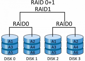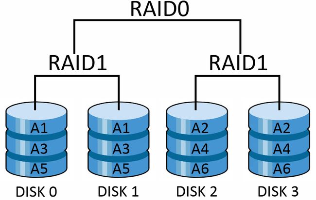 RAID10 (1+0) — зеркалированный массив, данные в котором записываются последовательно на несколько дисков, как в RAID0. Эта архитектура представляет собой массив типа RAID0, сегментами которого вместо отдельных дисков являются массивы RAID1. Соответственно, массив этого уровня должен содержать как минимум 4 диска и всегда чётное количество. RAID10 объединяет в себе высокую отказоустойчивость и производительность.
