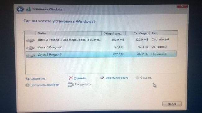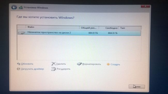 После установки драйвера появился созданный ранее раздел с размером 884,9Гб.