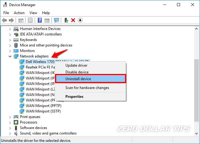 Шаг (3): Теперь щелкните правой кнопкой мыши по сетевым адаптерам один за другим и выберите опцию Удалить устройство .