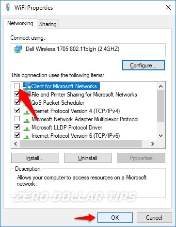 Шаг (4): Далее в диалоговом окне «Свойства WiFi» перейдите на вкладку «Сеть» и снимите флажок с самого первого параметра « Клиент для сети Microsoft », а затем нажмите кнопку «ОК».