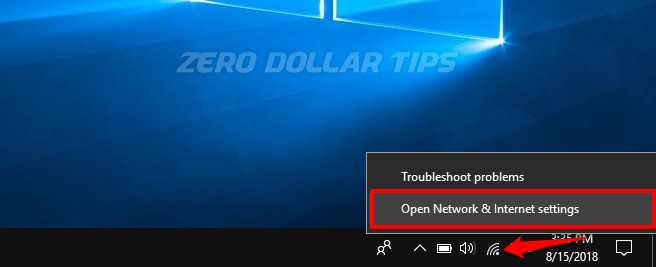 Шаг (1): Прежде всего, щелкните правой кнопкой мыши значок сети, расположенный на панели задач, а затем выберите опцию «Открыть настройки сети и Интернета».