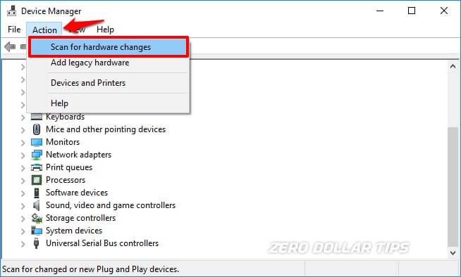 Если Windows не устанавливает драйвер сетевого адаптера автоматически, перейдите в меню «Диспетчер устройств» → «Действие», а затем нажмите «Поиск изменений оборудования», чтобы найти и переустановить правильный сетевой адаптер.