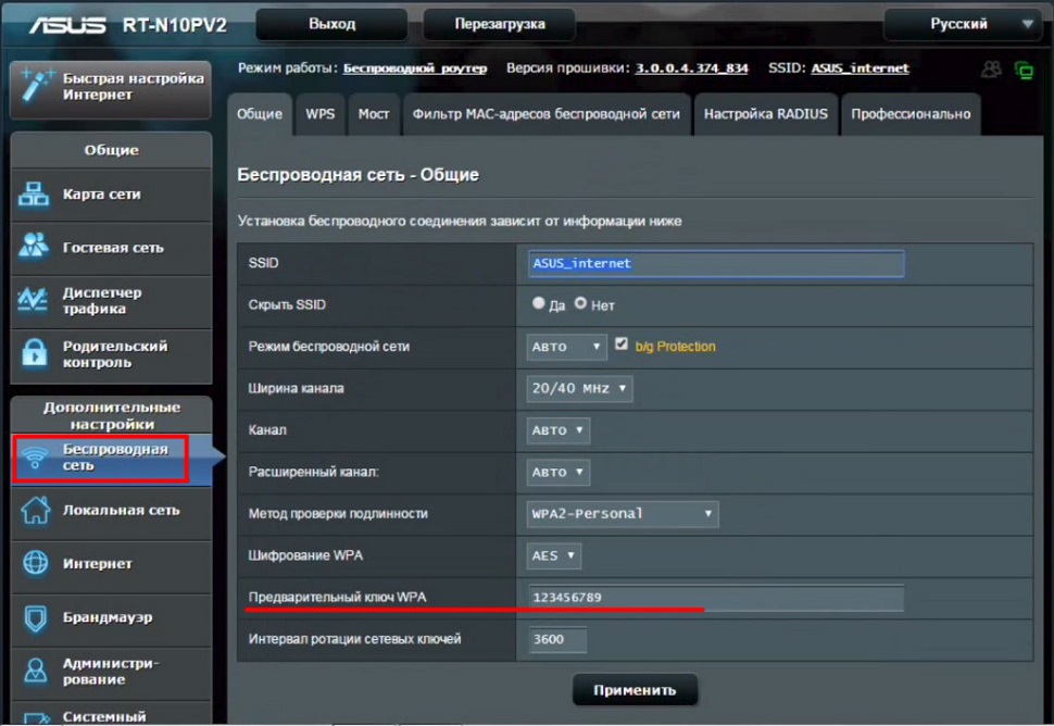 - В навигационном меню маршрутизатора войдите в раздел «Дополнительные настройки», а в нём выберите пункт «Беспроводная сеть». Пароль от сети Wi-Fi будет написан в строке «Предварительный ключ WPA».