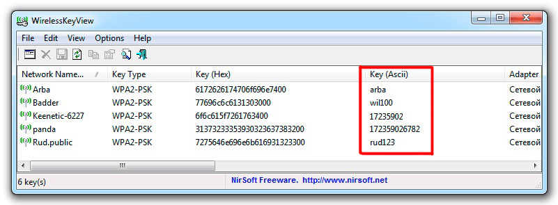 Скачать программу можно на любом сайте с бесплатным программным обеспечением. Загрузите, распакуйте и запустите WirelessKeyView, затем в рабочем окне программы найдите название своей сети Wi-Fi, и в графе Key (Ascii) увидите пароль для входа.
