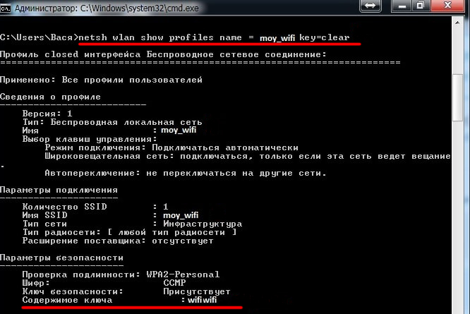 - В открывшемся окне командной строки введите команду netsh wlan show profiles name = “наименование вашей сети Wi-Fi” key=clear и нажмите Enter. В полученной информации найдите блок «Параметры безопасности», где напротив строки «Содержимое ключа» увидите пароль Wi-Fi.