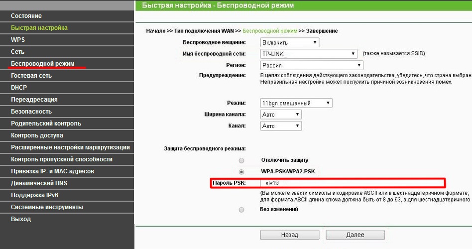 - В открывшемся окне настроек роутера выберите раздел «Беспроводной режим», и напротив строки «Пароль PSK» увидите пароль Wi-Fi.