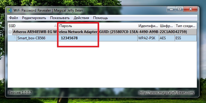- После скачивания запустите программу, которая сразу произведёт автоматический поиск активных Wi-Fi сетей. Найдите своё беспроводное подключение, где в строке «Пароль» будет отображена необходимая информация.