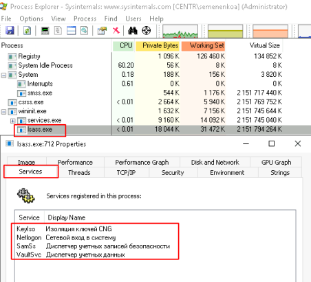 Keylso (изоляция ключей CNG). Хранит приватные ключи в процессе lsass.exe. Напрямую служба не связана с криптографией, но она обеспечивает долговечное хранение криптографической информации.