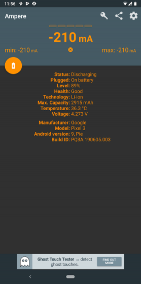 Ampere поставляется с парой других функций, которые вам также могут пригодиться. Он сообщает вам, находится ли аккумулятор вашего телефона в хорошем состоянии, доступное напряжение и текущая температура.