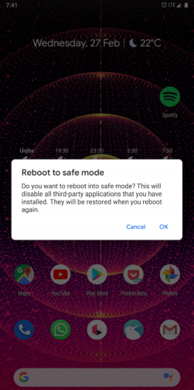 В качестве следующего шага попробуйте загрузить телефон в безопасном режиме. По сути, безопасный режим — это среда с песочницей, которая ограничивает ваш телефон только программным обеспечением, которое он изначально поставлял. Это означает, что любые загруженные вами сторонние приложения не будут работать в безопасном режиме.