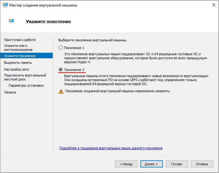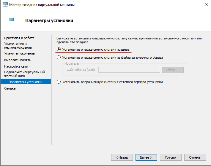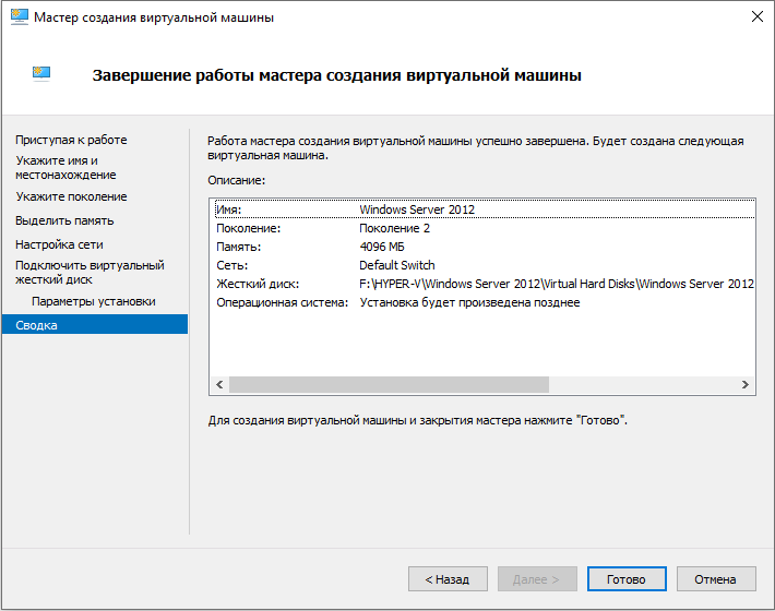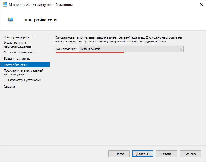 В настройке сети выбираем Default Switch. Настроим сетевое подключение после создания ВМ.