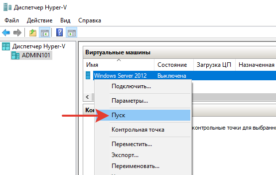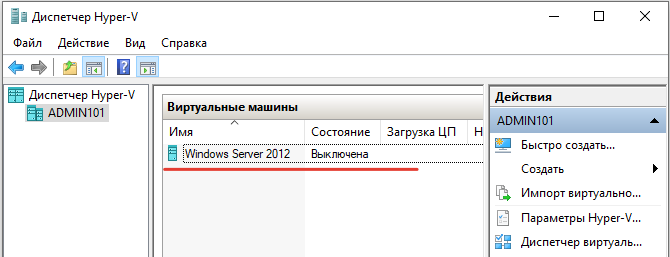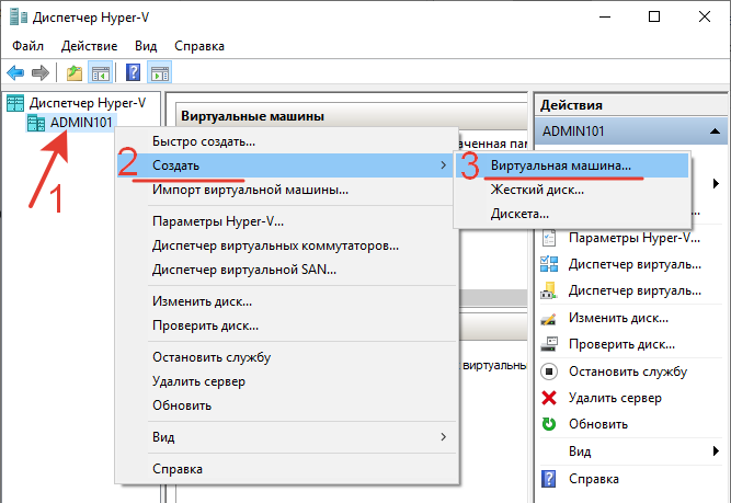 В открывшемся диспетчере жмем правой кнопкой мыши по серверу и выбираем: Создать >> Виртуальная машина.
