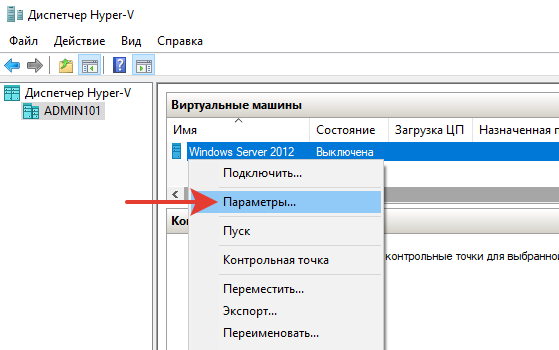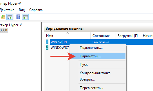 Чтоб попасть в параметры нужно нажать правой кнопкой мыши по ВМ и выбрать из выпадающего меню «Параметры…»
