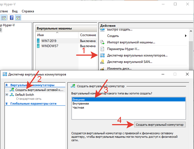 Переходим в диспетчер виртуальных коммутаторов и создаем новый.