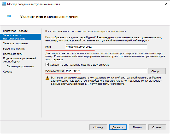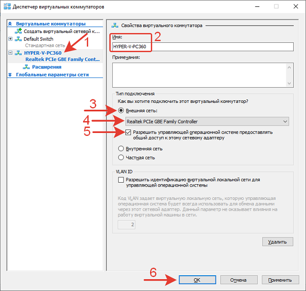Это означает, что физический сетевой адаптер становится портом к виртуальному коммутатору, через который ВМ и физическая машина будут связываться с внешней сетью (в смысле с локальной сетью организации). Альтернативный вариант – использовать несколько физических адаптеров. Один для виртуального коммутатора и ВМ, второй – для физического компьютера на котором работает Hyper-V.